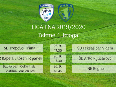 V četrtek, 26. 9., bodo odigrane tekme 4. kroga Lige ENA: Skupina A ŠD Tropovci Tišina – ŠD Teksas bar Videm četrtek, 26. 9., ob 17:30 Tišina Skupina B... Read More