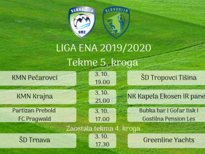 V četrtek, 3. 10., bodo odigrane tekme 5. kroga Lige ENA: Skupina A KMN Pečarovci – ŠD Tropovci Tišina četrtek, 3. 10., ob 19:00 Pečarovci Skupina B KMN Krajna... Read More